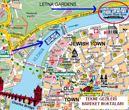 ** Tekne turları için genelde buluşma noktası metro istasyonu Staroměstská 'e yürüyerek 5 dakika yürüme mesafesinde, şehir merkezinde ise Old Town Square (Staromestske namesti) dır,