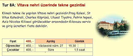 Tekne gezisinden çok fazla beklentiniz olmayacak ise benim önerim -- Prag Bot işletmesi olacak ( WEB ) , Diğer tüm gezi ücret ve bilgilerine buradan ulaşın.. Acenta ; Josefov - Cechuv köprüsü başında , Prag Otel İntercontinental'in hemen yanı başındadır.Ve Köprü altında , iskelelerden yolculuk başlamakta ve sonlanmaktadır.Tercihinize göre ücretler Tam : 250 - 2500 Czk arasında değişir..