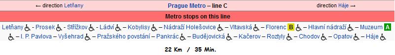 • Line C (Red) – Kırmızı hat : Letňany ile Háje arasında ( kuzeyden güneye ) 20 istasyondan ibarettir.Toplam yol yaklaşık 36 dk. dolayıdır.