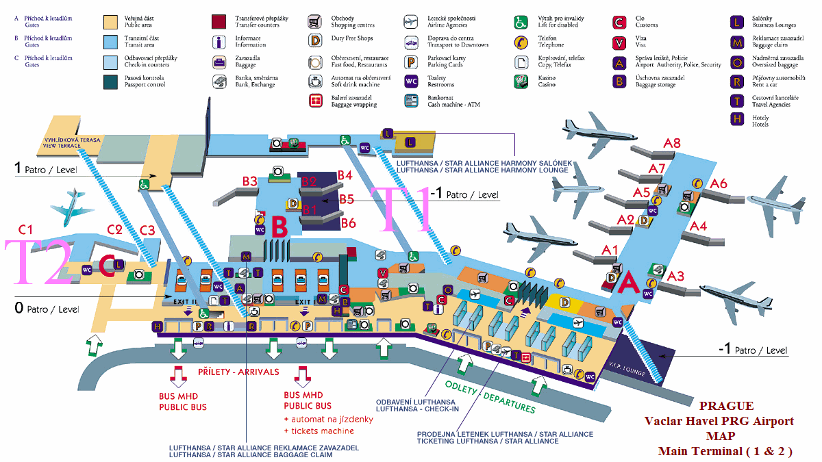 Kuzey Terminalleri olarak : North 1 ( T1 ) ve North 2 ( T2 ) : Rutin uçuşlar için kullanılırken , South ( Güney Terminal )( T3 , Terminal Jih ) düzensiz olarak , özel ve charter uçuşlar için kullanılır - VİP & ( devlet , protokol ) uçuşlar yada küçük uçaklar içindir.