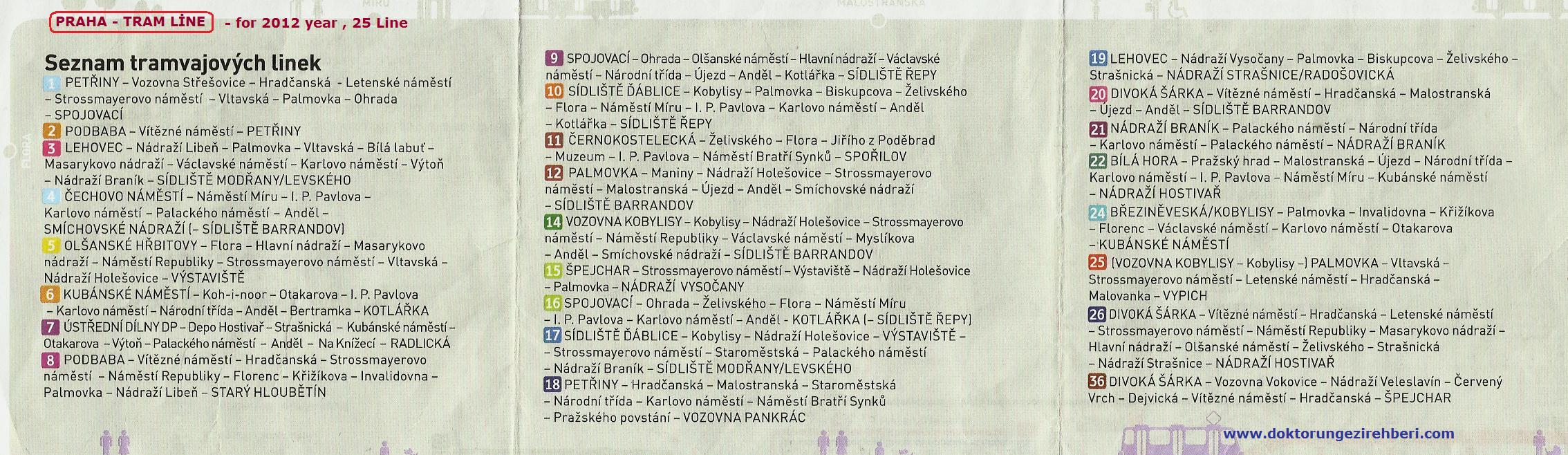 2012 yılı için Prag tramvay hatları ve güzergahları ( 25 adet ) aşağıdaki tablodaki gibidir !