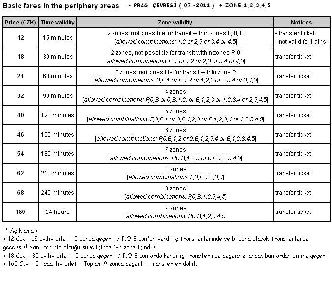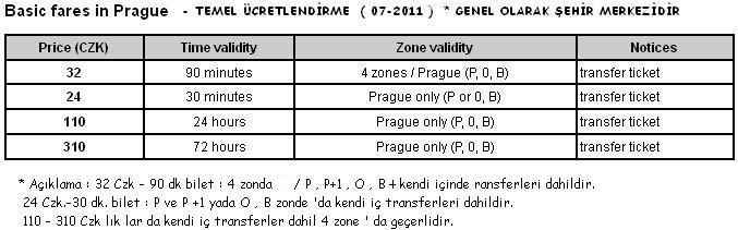 Prag’da toplu taşımacılıkta , şehir merkezine ve yakın çevresine ( yaklaşık 20 km.lik mesafe ) ait 4 adet transfer bölge ( Zone ) tarifesi mevcuttur < standart tarife > .
