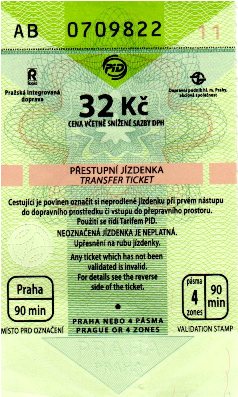 32 CZK ( Kc ) bedeli olan bu standart bilet , 4 ( Zone ) bölgede 90 dk. süre içinde toplu taşımadaki tüm araçlarda transferler dahil geçerlidir.Prag’ın merkezindeki 2 bölge ile birlikte ( P + P1 ) , merkezden 20 km kadar uzakta olan alanlara ( Airport ) da hitap eder.