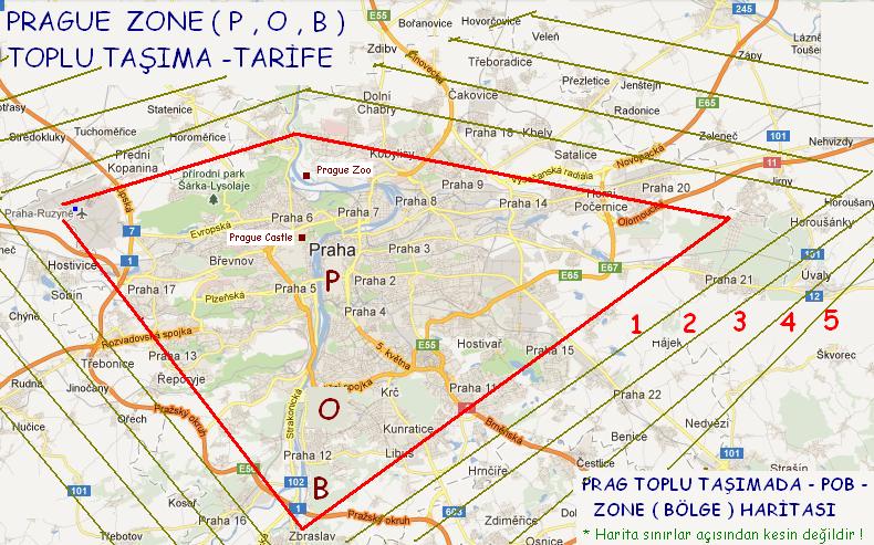 Ayrıca Prag Perifer - uzak çevre - alanları için de ; 1,2,3,4,5 zone ( bölgeye )' a ayrılır. Bu şekilde ücretlendirmede 9 farklı zone vardır ( Prag Zone bölgeleri - tıklayın ) .Bu bölgeler kabaca gösterilecek olursa ;
