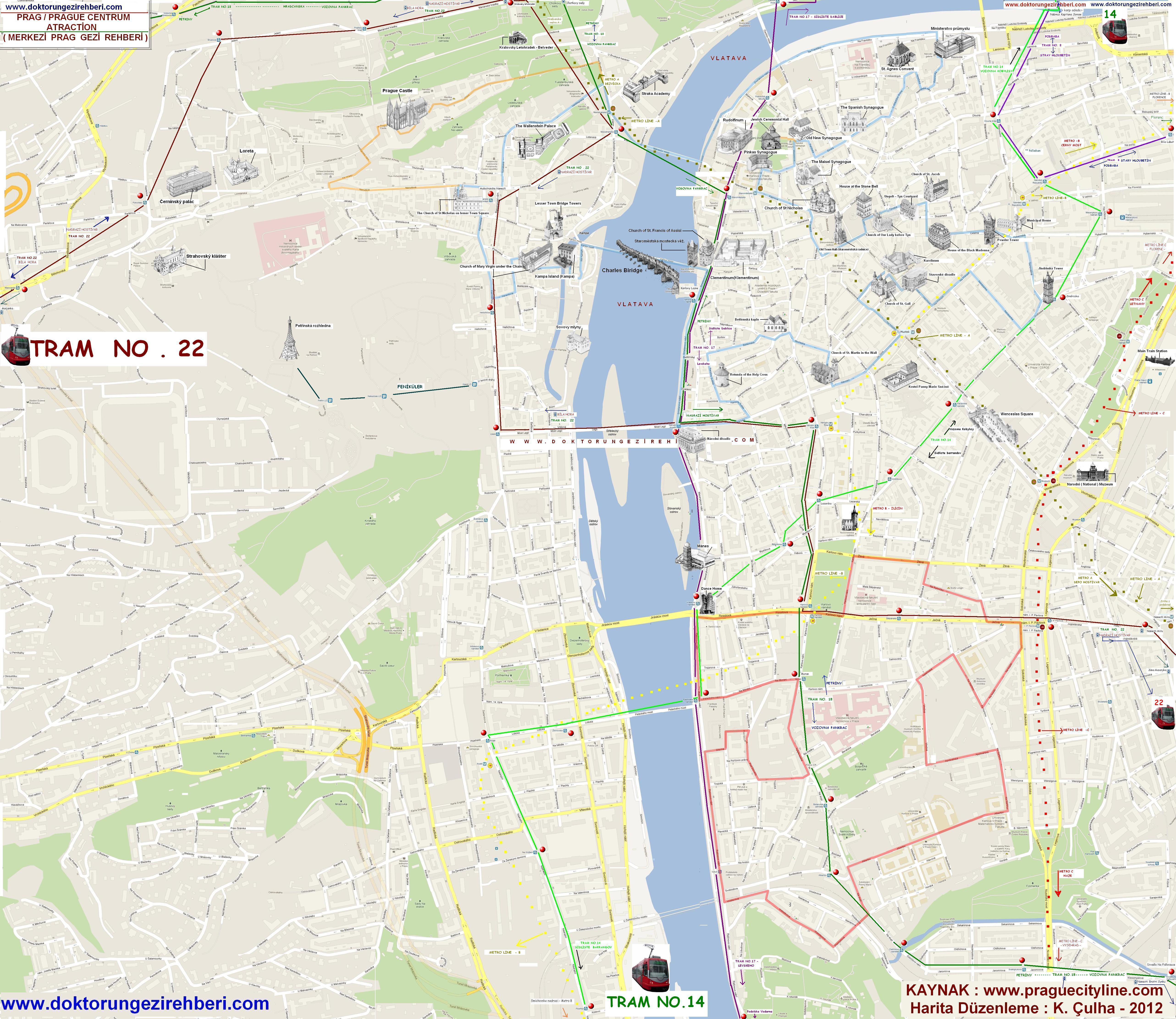 + Metro & Tramvay Güzergahları ( Metro & Tram Line map )( 2014 için güncel ) ( harita - tıkla ) * Prag metrosu ve tramvay hatları için detay & duraklar isimleriyle.