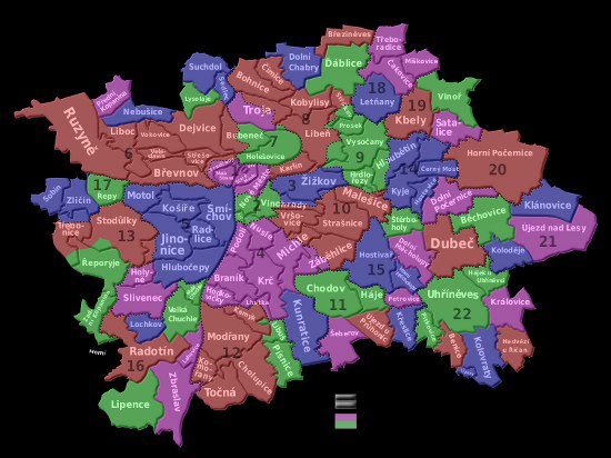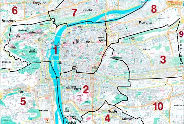 Şehir yerel yönetim hizmetleriyle beraber kadastro yönünden ele alındığında 22 bölgeye ayrılmıştır.Bununla birlikte Prag gezisi denince gezinin daha kolay anlaşılabilir olması nedenleriyle kent genelde daha az sayıda bölgelere ayrılarak anlatılmaktadır.Aşağıdaki bilgi paylaşımı gezi açısından kafanızı karıştırmasın!