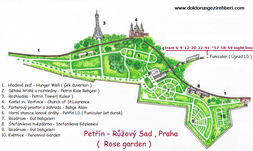 Ruzovy Sad ( Rose garden ) ( foto ) : Binlerce gül içeren bahçeler topluluğu Petrin tepesinde yer alır.. 6 hektarlık bu bahçeler topluluğu hem dinlenme , hemde 320 m. tepeden Prag'ı panaromik olarak görme alanıdır..