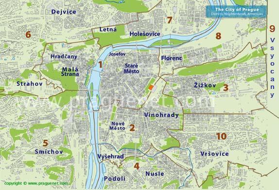 + Staré Město (Eski Şehir) : Eski Şehir, Charles Köprüsü’yle Küçük Mahalle’ye bağlıdır. Uzun yıllardır çok hareketli bir ticaret merkezi olan bu bölge—esnaf, tüccar ve Jan Hus destekçileriyle dolu—onuncu yüzyıldan itibaren çok hızlı bir şekilde gelişmiştir. Jan Hus, Çek’lere özgü bir Katoliklik oluşturmak için çalışmalar yapan bir kilise reformcusuydu. Şehir surları modern yol haritasından takip edilebilir (halkalarla güçlendirilen duvarın sisteminin kalıntılarından bir parçası Barut Kulesi’dir ve bunun diğer yarısı nehir tarafındadır). Kıvrıma yakın olan bataklık alan—daha az ilgi çekici ve Yahudilere ayrılan—Yahudi yerleşim alanına dönüştürülmüştür (bugün Yahudi Mahallesi ya da Josefov olarak bilinmektedir).