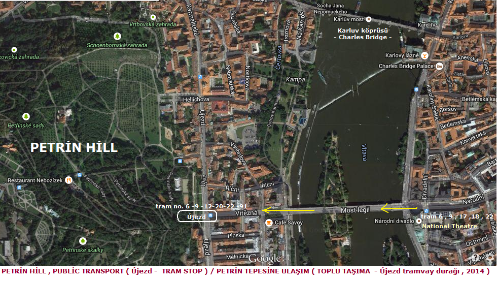 Kentin neresinde olursanız olun ( isterseniz otel yerleşimi sonrası , kısa dinlenme akabinde ) bu allana ulaşmak son derece kolay ve kısa sürede olacaktır.Petrin'e çıkmak için öncelikle kentin batı yakasında olan " Újezd " sokağında ayni isimle anılan istasyon noktasına tramvay ile ulaşmak olacaktır. Bu alana kentin toplu taşımacılığında önemli yeri olan tramvay sisteminin yaygın ağı ile siz kolayca ulaşırsınız ( tram no. 6 - 9 - 12 - 20 - 22 - 91 - * 57 - 58 - 59 night line - hatları buradan geçecektir - 2014 güncel hatlardır ).Şehirde bulunduğunuz alandan size yakın olan bu hatlı tramvaylara , Ujezd yönüne gidecek şekilde binin.Metro Line B - sarı hattın ; Karlovo Namesti ve Narodni Trida durakları bu tramvaylara biniş için en ideal bağlantı noktaları olacaktır..Yada Vlatava nehrinin hemen yanında yer alan şehir merkezli , ( National Theatre - Ulusal tiyatro ) Národní divadlo'nun önünden geçen Vitezna caddesi boyunca ( batı yönünde ) Most Legi köprüsü üzerinden yürüyerek 5 - 10 dk. içinde bu alana ulaşın ( foto )( ulusaltiyatro'ya ulaşım : tram 6 , 9 , 17 ,18 , 22 ).Toplu taşıma Ulaşım haritası ( tıkla ).