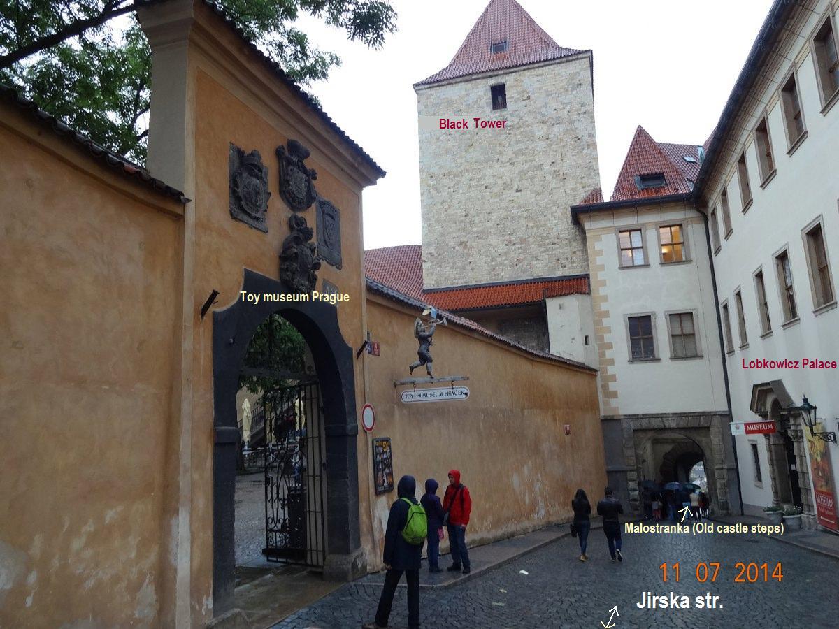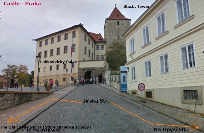 Kuleyi görüntüledikten sonra , Taş kemerlerden geçtiğimizde (foto), Jirska sokağınının küçük bir meydanda sonlanacağı , Prag manzaralı küçük bir alana çıkacağız.Taş kemerin üzerindeki kule ; Black Tower'dır.1135 te kale sur kapısı doğuda inşa edilmiş.1541 kale yangınında duvarlar yanmış ve uzun süre siyah renkte kalmış ve bu ismi almıştır ( tarihte cezaevi konumundadır ).
