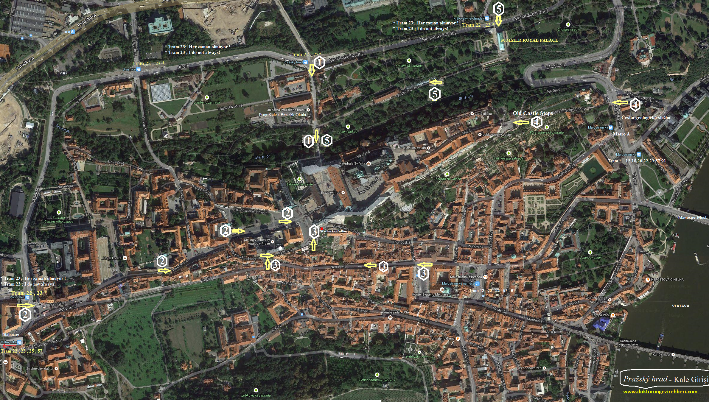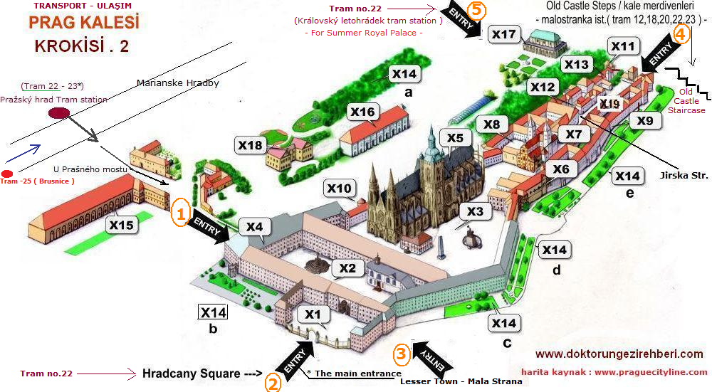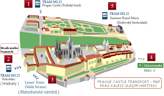 Kale gezimiz ; Hradcanske Namesti - Kale Meydanı üzerinden başlayacaktır. Burası Kale için Ana giriş kapısı olup , haritada 1 - 2 - 3 - 5 numaralı ulaşım seçeneklerinin kullanıldığı gezi başlangıç noktasıdır.