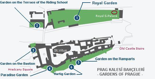 Prag kalesinde ; 2 'si kuzey ( Royal ve Terrace of riding school gardens ) , 3 'ü güney ( Paradise , Hartig , Ramparts gardens ) ve 1 adet ( Bastion garden ) batı olmak üzere 6 bahçe bölümü vardır.