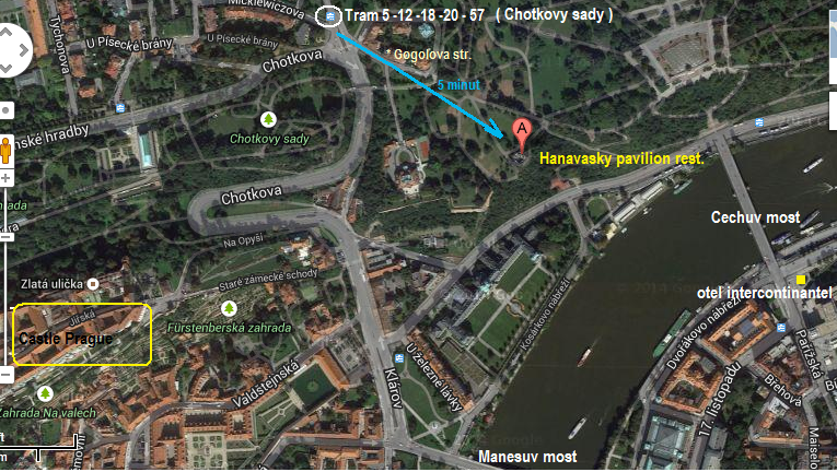 Letna park alanında ; Hanavasky pavilion restorant ( web , Letenské sady 173 - 170 00 Praha 7 ) bulunur.Prag için tepeden güzel bir manzarada yemek yemeniz biraz pahalıdır.Rezervasyon gerekebilir.Ulaşım ; Chotkovy sady tramvay durağına gelin ( tram 5 -12 - 18 -20 -57 ) , Gogolova sokağına girerek park alanından 5 dk. yürüme ile ulaşacaksınız ( harita ).Cechuv köprüsü başından tepeye baktığınızda burası rahatlıkla görülür..