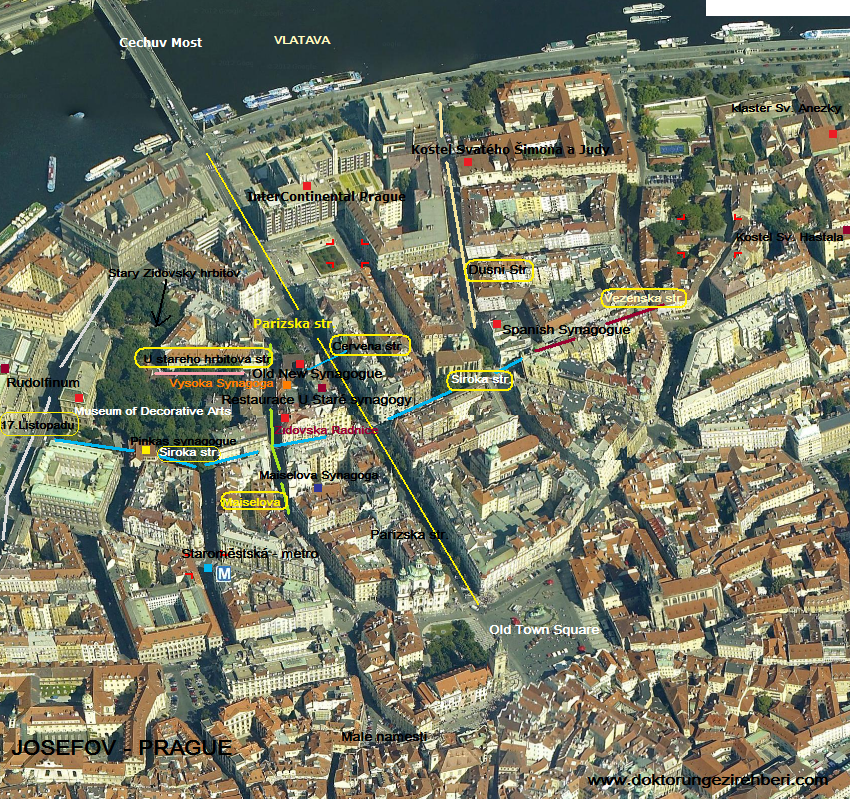 Paris caddesinin yarı mesafesinde 150 - 200 m. sonrası sağdan " Siroka " sokağına giriyoruz.Sokak devamındaki ( Vězeňská str. ) alanda bir sinagog bulunur ;