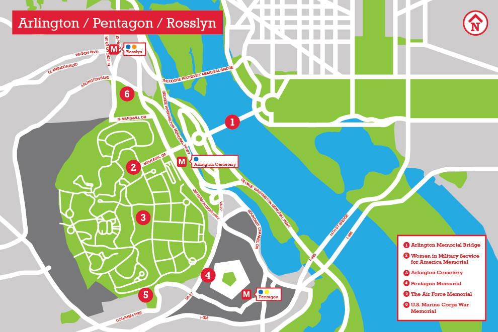 National Mall gezimiz ve Washington DC ( Şehir merkezli ) gezi alanımız burada sonlanmış olmakla beraber, Lincoln park'ın hemen batı bölgesi başka bir eyaletin , başka bir kentine ev sahipliği yapacaktır.Potamac nehri üzerinde yer alan Arlington Memorial Bridge - köprüsünü yüreyerek geçip başka bir eyaletin kentine ulaşmız oluruz ( Arlington - Virginia ).Washington tarafından bakıldığında ( Lincoln Memorial ) Washington'un hemen yanı başındaki mahalle olan Rosslyn ; Arlington - Virginia için yüksek katlı bina ve ofisleri , Arlington Ulusal mezarlığını , Theodore Roosevelt Adası ve Arlington Ulusal Havaalanını ile otel & restoran ve alışveriş imkanlarını sunan bir yerdir.Ayrıca Arlington'da ; İwo jima memorial / US Marine Corps War Memorial ( web ) , Theodore Roosevelt Island , Pentagon'da görülecek yerlerdendir..