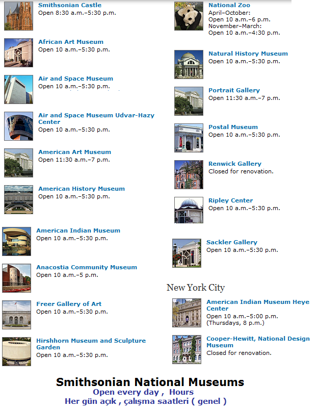 2 adeti New York City'de olmak üzere , 19 müze & galerileri ve Ulusal Zooloji Parkı kompleksini içeren " Smithsonian Enstitüsü" Dünyanın en büyük müzesi ve araştırma grubudur..25 aralık hariç genelde yılın her günü açık olan müzeler kompleksi ÜCRETSİZDİR!