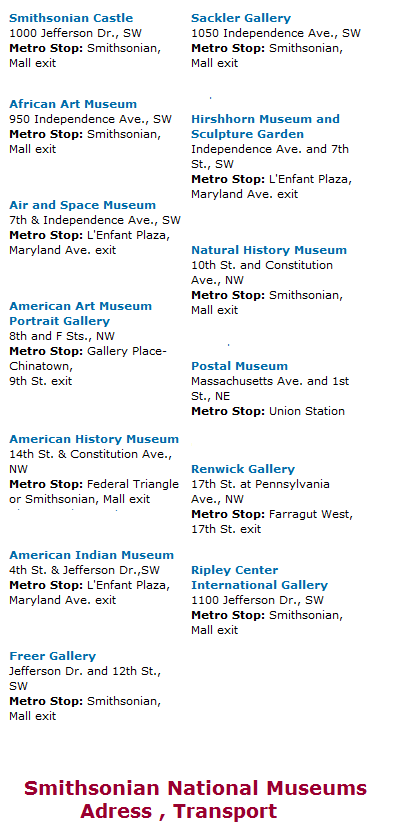 West Basin Drive, SW - DC , ulaşım : 32, 34, ya da 36 metrobüs / metro; Orange & Blue line , Smithsonian istasyonu