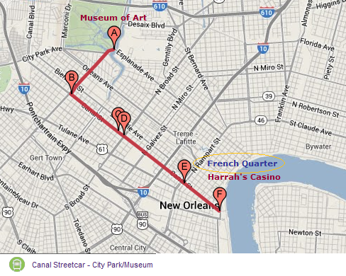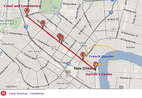 The Canal Street Line : Kentin en işlek bölgesinde 5 mil kadar yol güzergahında Canal Street boyunca bir uçta French Market'ten ( Central Business District ) , diğer uçta da Mid City area'ya ( City Park -New Orleans Museum of Art & New Orleans Botanical Garden ve tarihi mezarlık alanına ) kadar uzanır.