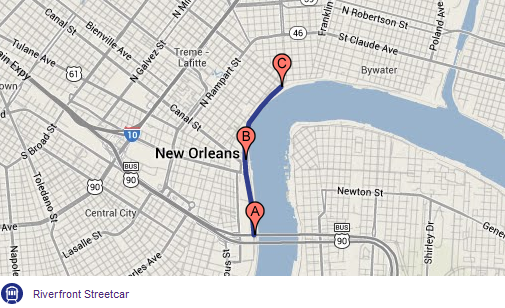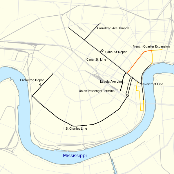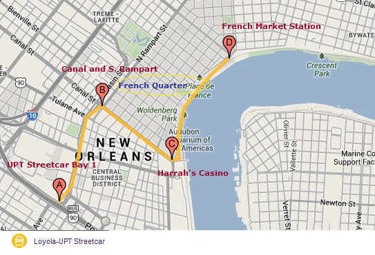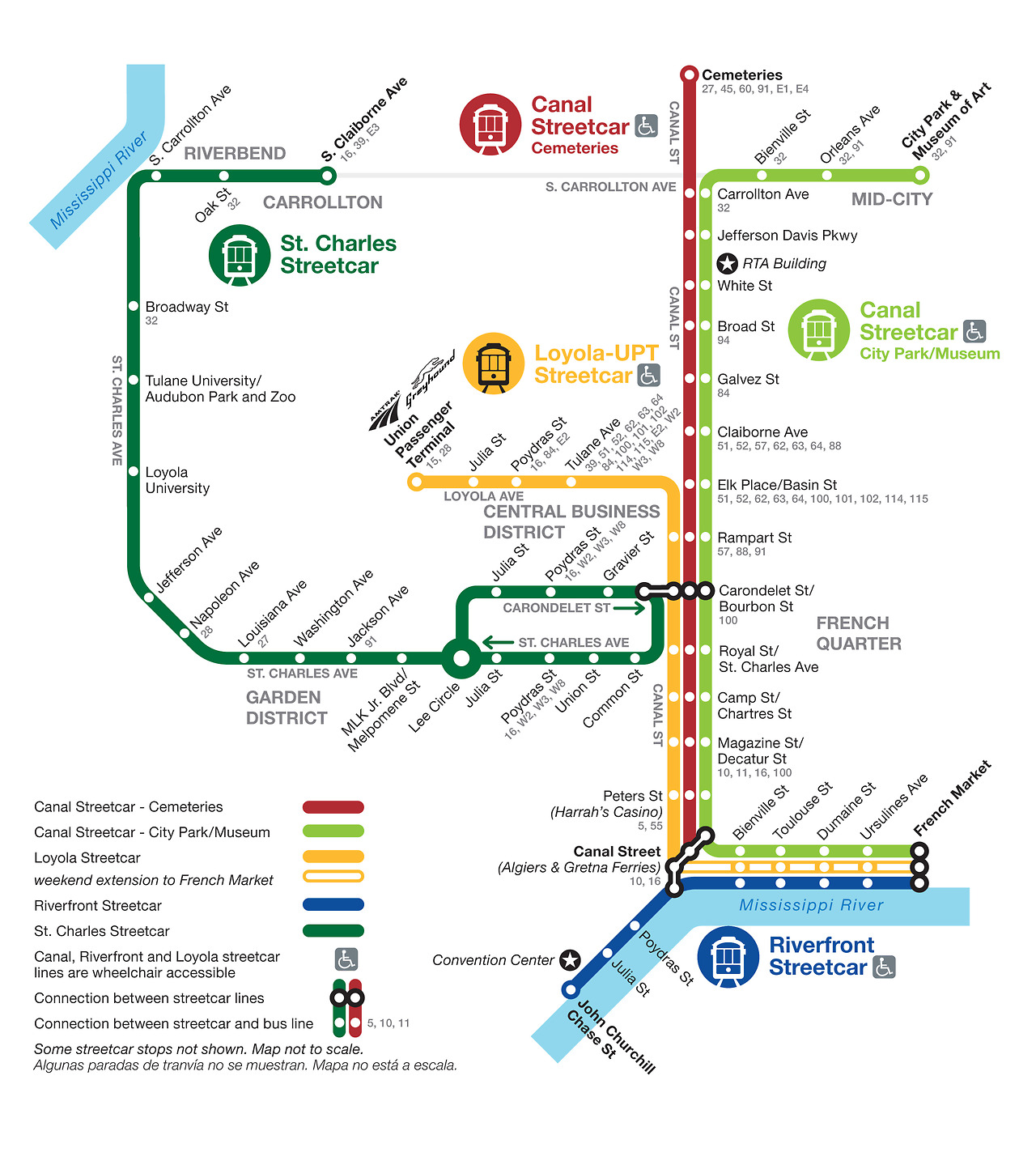 Hatlar : St. Charles Streetcar ( koyu yeşil hat ) , Riverfront Streetcar ( mavi hat ) , CanalStreetcar ( kırmızı ve açık Yeşil - 2 hat ) , Loyola- UPT Streetcar ( orange hat )
