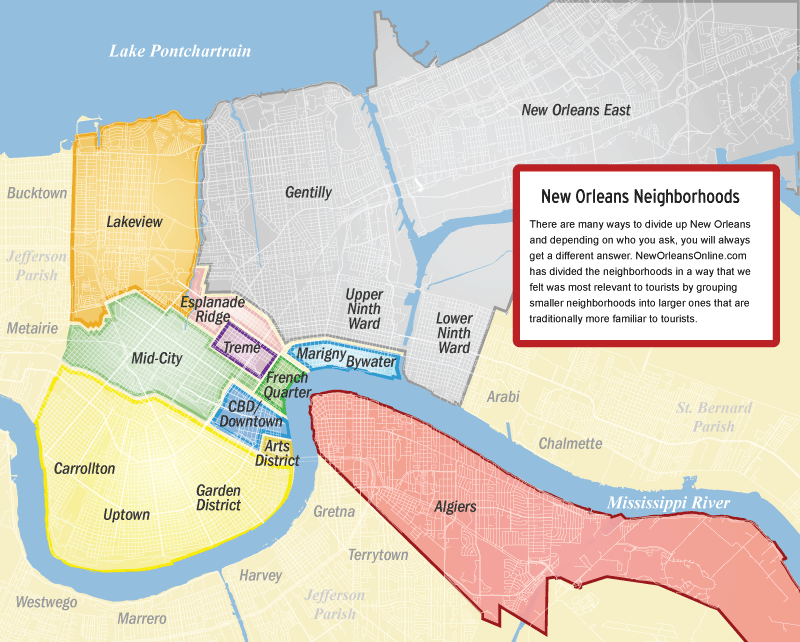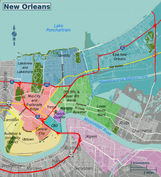 + Central Business District : eskilerin "Downtown" dedikleri alandır.Fransız Mahallesinin bitişiğinde yer alan bölge ; finans merkezi , gökdelenler ve yüksek katlı otellere ev sahüplüğü yapar.Bölgedeki Superdome - kubbeli stadyum dünyanın en büyük spor mekanlarından biridir. . Mükemmel restoranlar, çok sayıda müze (National D-Day Müzesi, Louisiana Çocuk Müzesi, Güney Sanat Ogden Müzesi ve Çağdaş Sanatlar Merkezi ) ve Julia Caddesi üzerinde bulunan bir galeri ile hareketlidir. Bu alan aynı zamanda Art' Distric olarak bilinen Warehouse District bölgesinide içine alır.