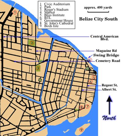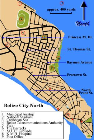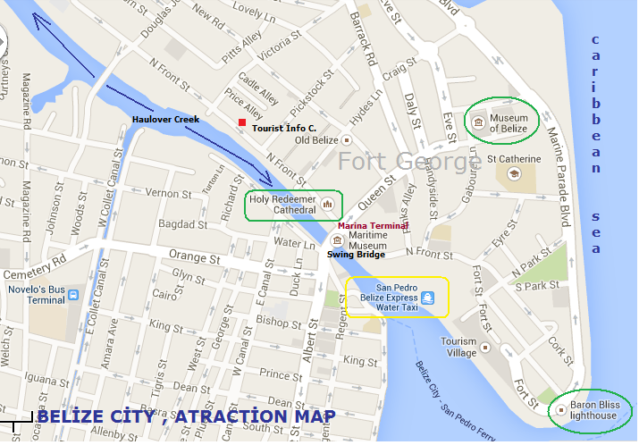 Haulover Creek ( dere ) tarafından şehir kuzey ve güney olmak üzere 2 bölüme ayrılır. Swing Bridge / Swing köprüsü , dere üzerinde bu iki yakayı birleştirir..Marine Terminal , kuzey yakasında Swing Bridge'in yanında yer almaktadır.Köprünün doğu yakasında , Marine ve Coastal Zone Museums ( Maritime museum ) bulunur..Batısında ise katolik kilisesi Holy Redeemer Cathedral yer almakta ( foto )..Bölgenin kuzey kısmının denize bakan uç kısmında ( Fort street ) ; Baron Bliss lighthouse / Fort George Lighthouse - deniz feneri ve Baron Bliss Memorial - anıtı bulunur ( foto ). Bu alanın kuzeyi Museum of Belize'e ev sahipliği yapar ( foto , web ).