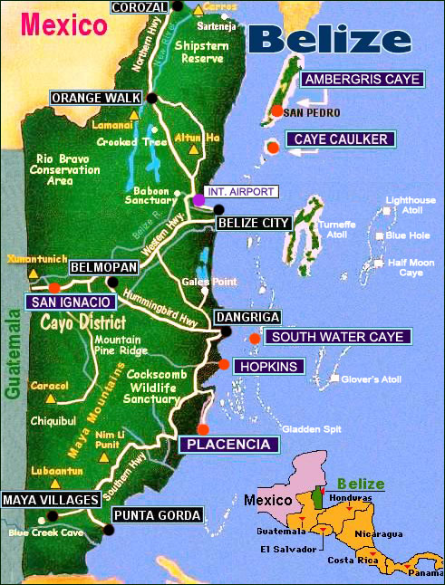 Belize ; Orta Amerika'nın doğu kıyı şeridinde bir ana kara ve irili ufaklı 200'e yakın ada ve adacılardan oluşmuş turistik bir ülkedir.Yağmur ormanları , tropikal bitki örtü ve iklimi , tarihi Maya Harabeleri ve kalıntıları , plaj ve kumsalları , dalış ve mercan kayalıkları ile ilgi çekmektedir.