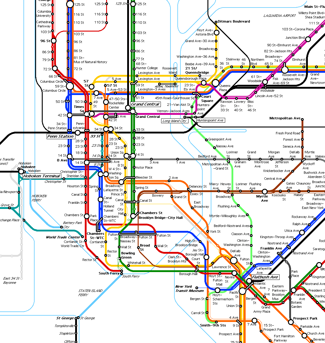 Metroya indiğinizde , sıklıkla Manhattan bölgesinde yönlendirme tabelalarında genellikle hattın Downtown (Brooklyn) ve Uptown olarak ikiye ayrıldığını göreceksiniz. Eğer bulunduğunuz durak, gitmek istediğiniz durağın kuzeyinde (yukarısında) ise, metro hattının downtown tarafına eğer güneyinde (aşağısında) ise hattın uptown tarafına gideceksiniz. (Örneğin siz 42. caddedesiniz ve kırmızı 1,2,3 hatları ile 59. caddeye gitmek istiyorsanız uptown 1,2,3 kırmızı hat tabelalarını takip etmelisiniz) Bir de gri L hattı gibi doğu-batı boyunca uzanan hatlar var. Bunlarda gitmek istediğiniz yönün haritada ne tarafta kaldığını bulmanız gerekiyor. Ama genel olarak kuzey-güney metro hatları Manhattan bölgesinde işinizi görecektir.Bazı metro duraklarında birden fazla hattın treni kesişebiliyor. Bu duraklarda hatlar arasında geçiş yapabilirsiniz. Ayrıca bazı duraklar arasında yer altından yürüyüş mesafesinde bağlantılar bulunmaktadır.