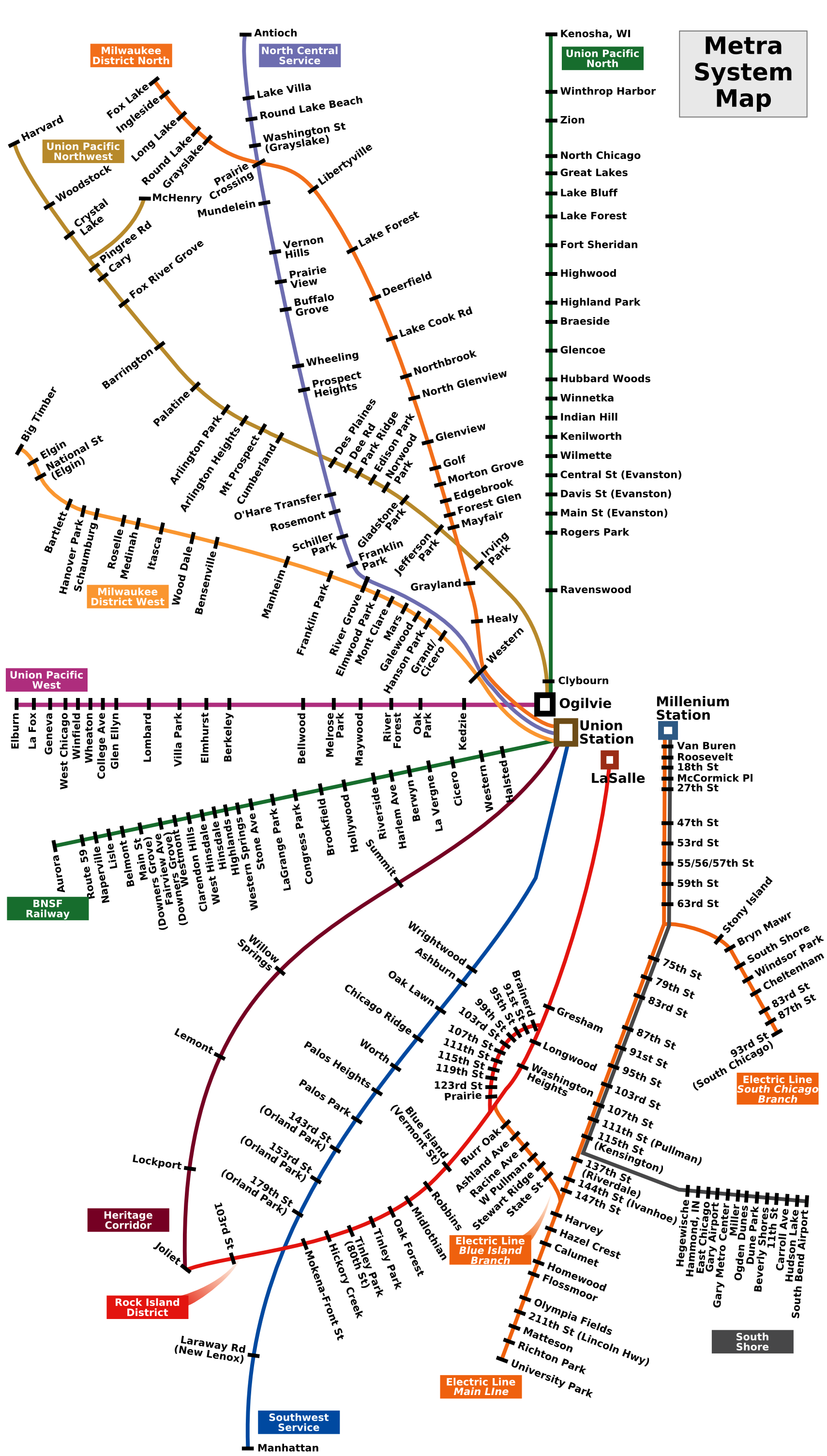 Metra: Chicago metra’sı bölgesinde 1-1.5 saatlik mesafedeki banliyölere kadar alanlarda , şehir merkezi arasındaki yolcu taşıma hatlarıyla , 2 katlı trenleriyle oldukça rahat ulaşım imkanını sağlar. 11 farklı hattı bulunan Metra, Chicago şehir merkezindeki Union Station ve civarındaki istasyonlardan başlar. Bilet fiyatları mesafeye göre değişmekte olup aylık kart imkanıda mevcuttur.