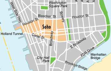 SoHo ismi; South of Houston’un (Houston Caddesi’nin güneyi) kısaltmasıdır / Houston str. , Broadway , Canal Str. ve Hudson ırmağı ile sınırlı bölgedir.Eskiden ağırlıklı olarak atölyelerin ve küçük işletmelerin bulunduğu bir bölgeyken günümüzde pahalı kafelerin, restoranların, sanat galerilerinin ve modayı yakından takip eden mağazaların yer aldığı bir mahalle hâline gelmiştir. Village’ın giderek pahalılaşmasıyla, güneye kaçan sanatçılar, SoHo’yu kendilerine mesken edinmişlerdir ve bu akımın başını Andy Warhol çekmiştir. SoHo’da eskiden ucuz olduğu için yerleşilen küçük tavanarası evler, günümüzde milyonlarca dolara satılmakta.Broadway en popüler alış veriş caddesidir.New Museum of Contemporary Art müzesi burada bulunmakta. Müze tüm dünyadan yaratıcı çağdaş sanat eserlerinin sunulduğu bir müzedir ( Prince str.235 , Bowery )