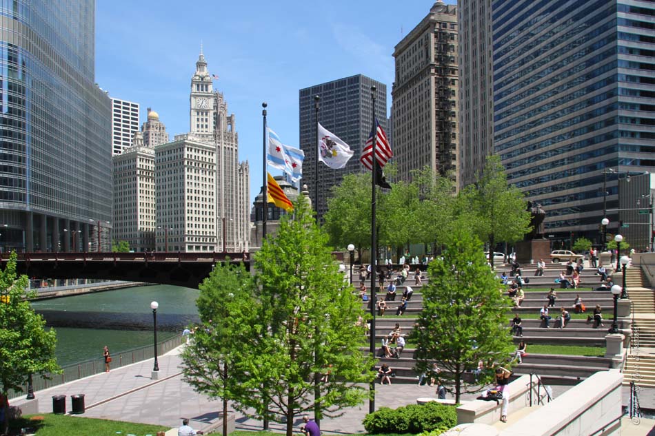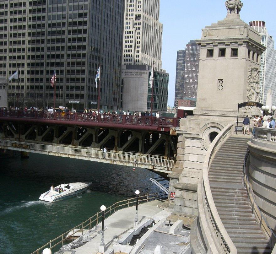 Biz şimdilik köprü üzerinden karşıya geçmiyoruz.Köprüye girmeden solundan, Chicago River Walk nehir güzergahı ile yaklaşık 300 m. kadar batıya yürüyelim.