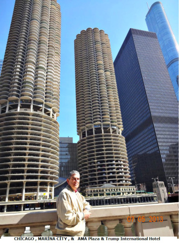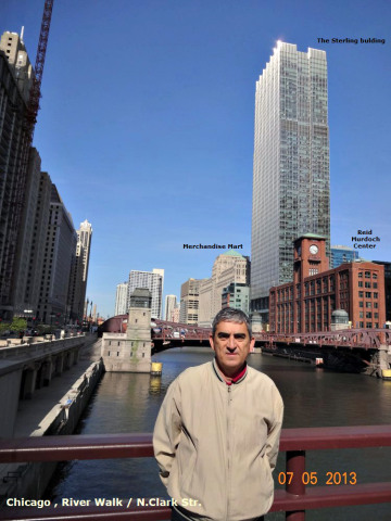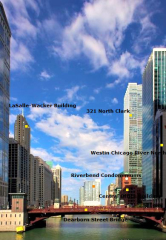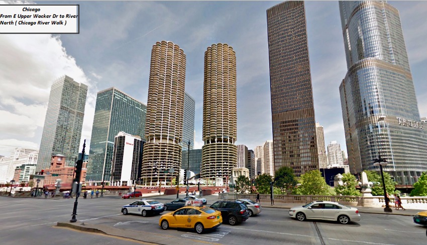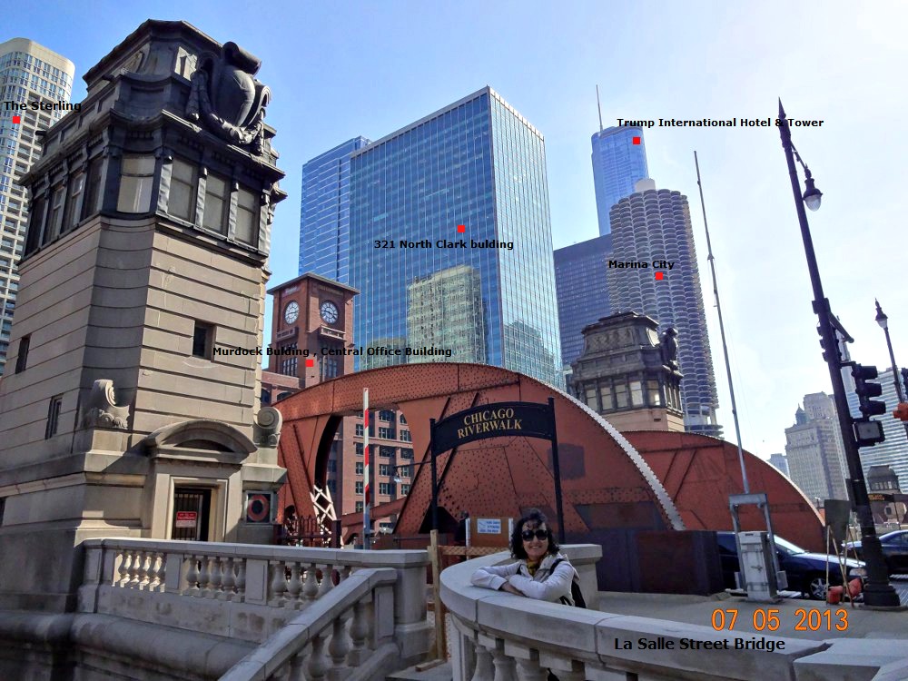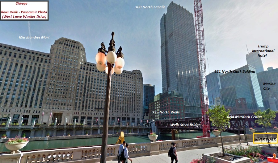 Üstteki fotoğrafta sağdan itibaren görülen yapılar : Trump International Hotel-Tower, MarinaCity ( aralarında Irv Kupcinet köprüsü), 321 North Clark Bulding (camlı büyük yapı), kırmızı ve çatıda saat olan Reid Murdoch Center ve yanındaki 300 north La Salle ve en soldaki yapıda Merchandise Mart’a ait görüntülerdir.Birde aynı görüntüye diğer köşeden bakalım..