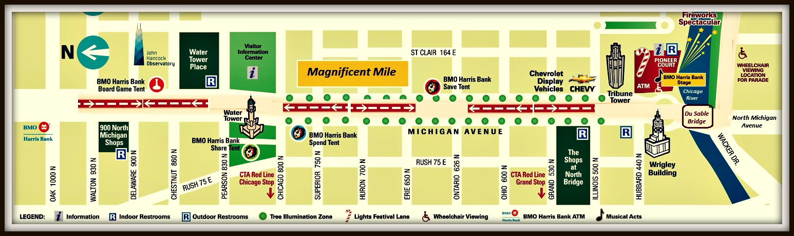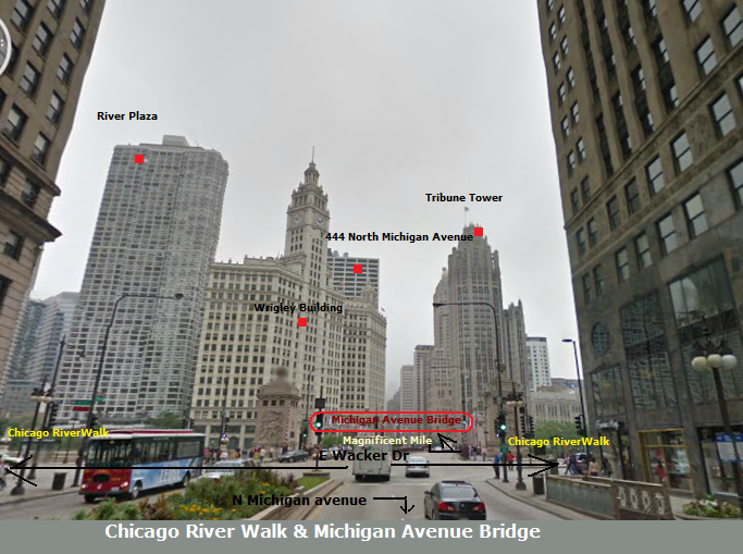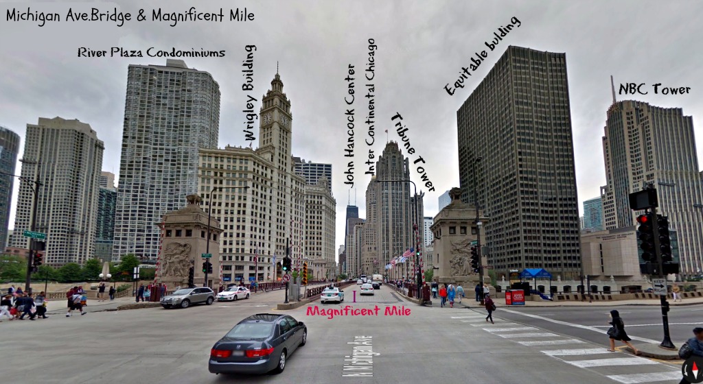 North Michigan avenue (bulvarı), River Walk ve Michigan avenue (Du Sable Bridge) köprüsünden sonra adını değiştirmektedir ve bilinen adıyla Magnificent Mile ” Muhteşem Mil ” olarak isimlendirilmiştir.