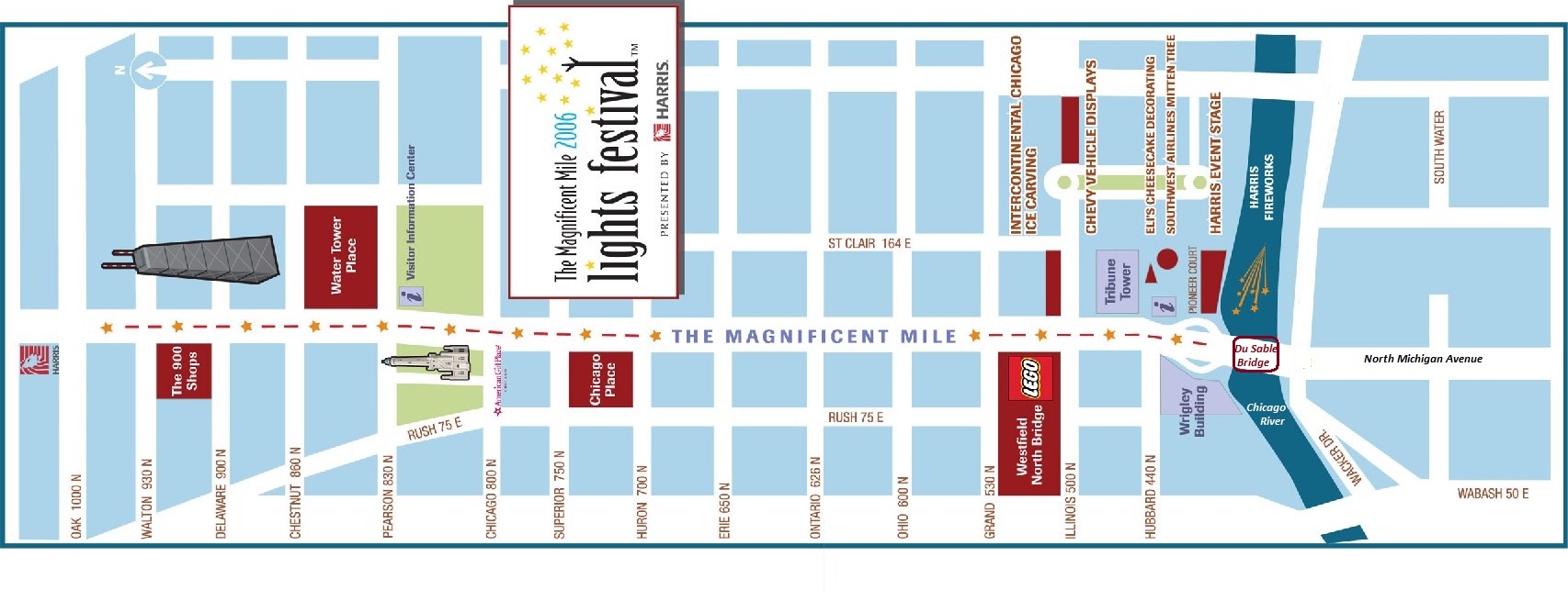 Michigan ave.köprü girişinde bir tarafta Wrigley bulding ,diğer tarafta ise Tribune Tower binası ve bunun da yanı başında yer alan “InterContinental Chicago” = 505 North Michigan Avenue yer alacaktır.İçerisinde bulunan yüzlerce dükkan ve restoranı ile Water Tower Place ( meydanı ) , 1871 büyük yangından tek harap olmadan kalan tarihi Water Tower ( Su kulesi ) , Hancock Tower , Allerton Hotel ve Drake Hotel gibi ünlü otelleri içerir. Muhteşem Mil ve çevresi festivallere eğlencelere ışıl ışıl ve canlılığı ile ev sahipliği yapar.Near North Side bölgesinde kalan bu cadde; North Avenue, Lake Shore Drive, Oak Street, ve Clark Street ile çevrili Gold Coast semtine de komşudur .Semt ünlü yangın sonrası büyümüş, gelişmiş ve Şikago’nun zengin mahalleleri arasına katılmıştır.
