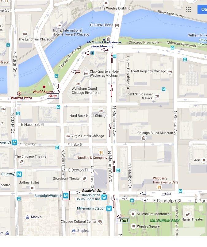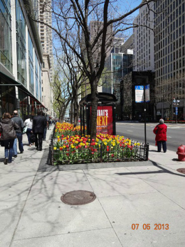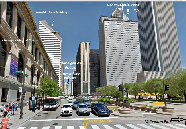 Milenyum park’ın önündeyiz.Yönümüz kuzey..North Michigan bulvarında yürüyeceğiz..Sağlı sollu çok katlı binalar arasındayız..Cadde mağaza, restorant ve benzeri hareketli alanlara sahip..Hedefe olan uzaklık yaklaşık 1 km. kadar.