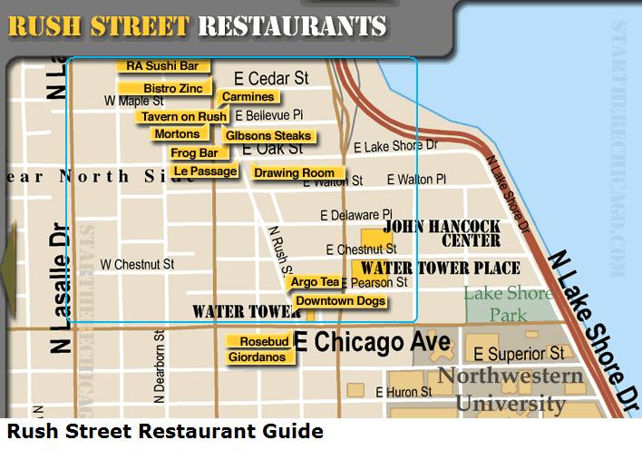 Su kulesinin sol yanından , East Chicago ave. caddesi ile en kuzeyde East Cedar str. sınırları arasında olup , N State str. ile devam edecek olan Rush Street , bölgenin restoranlar ve cafe’ler zincirini oluşturur.Buralar yemek konusunda en yoğun mekanlara ev sahipliği yapar.