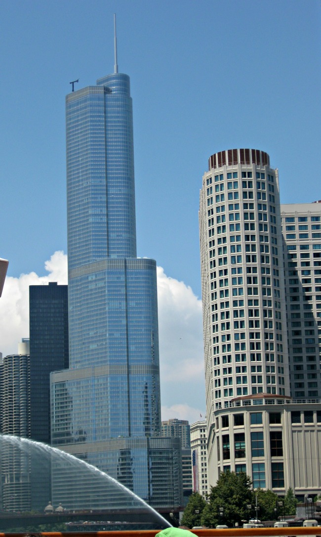 İç içe geçmiş silindir görünümlü , camsı gökdelen Trump International Hotel & Tower Chicago (401 North Wabash Avenue adresindeki bu yapı , 2009 yılında tamamlanan 89 katlı ve 415 m. yüksekliği ile kentin 2. en yüksek binasıdır. web1 – web2