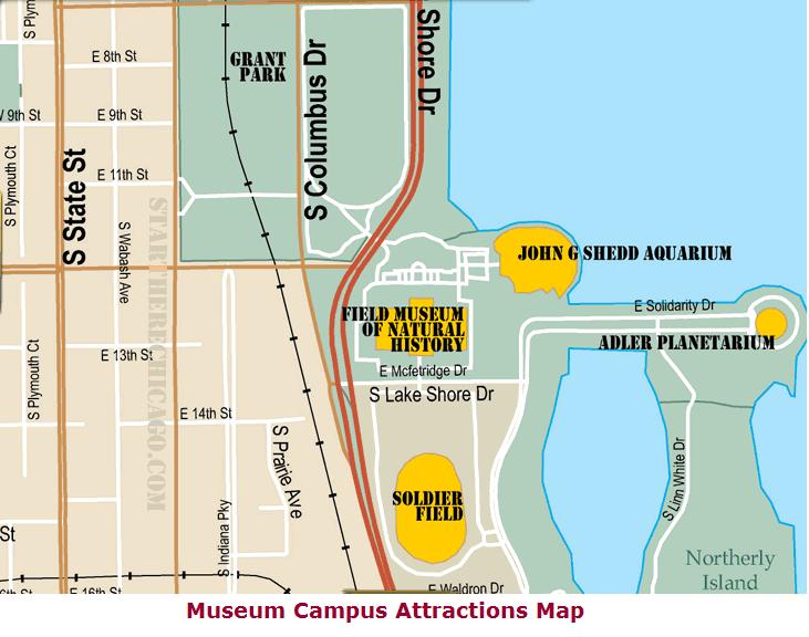 Ulaşım : Green , Orange , red ( yeşil , portakal , kırmızı hat ) subway / Roosevelt durağı yada Metra / Tren ( kahve rengi hat ) – Museum Campus/11th St. durağı