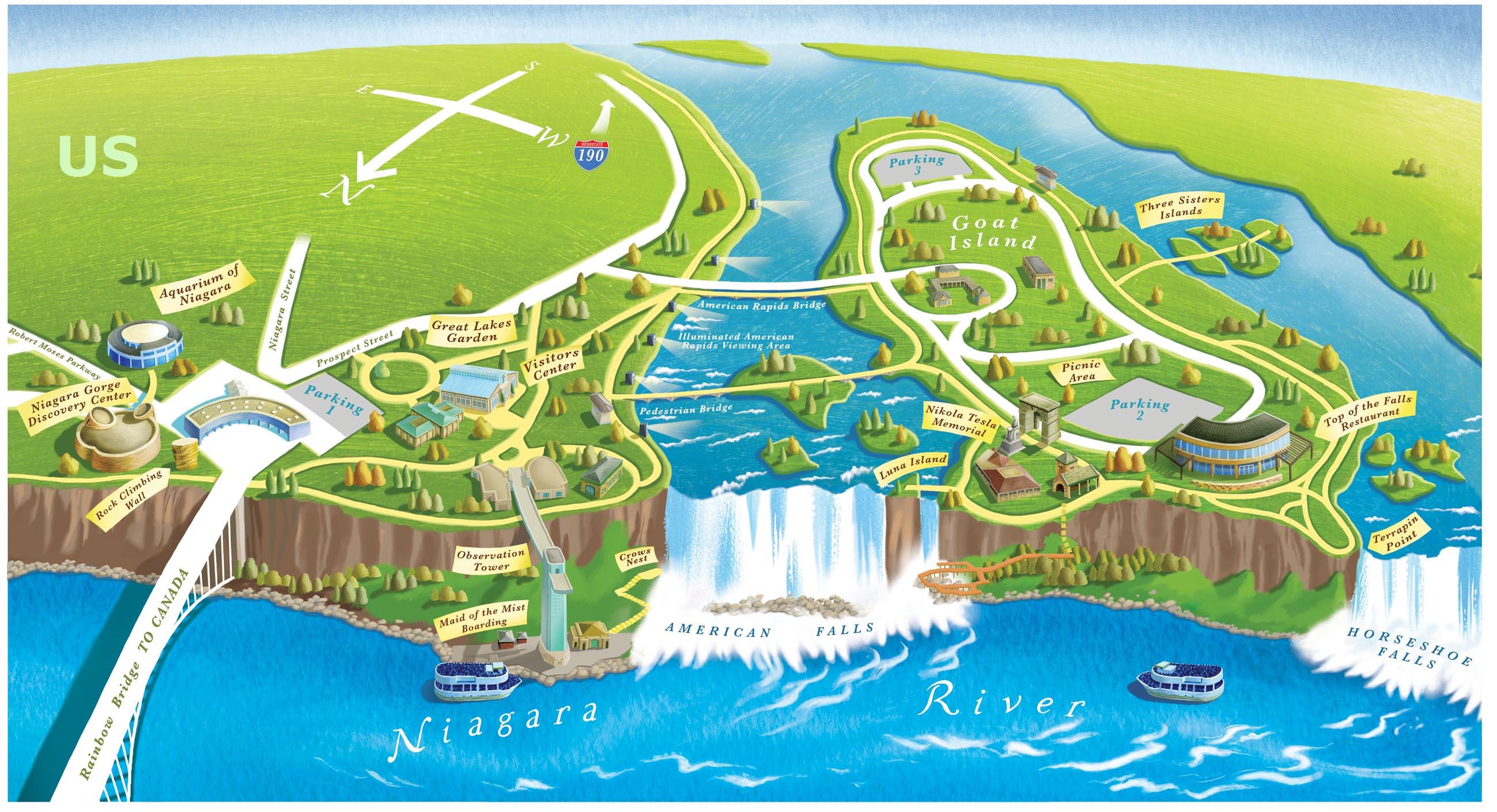 Goat Island, nehrin ortasında bulunan ve New York tarafından kolayca ulaşılabilecek bir nehir adasıdır. Yıllar önce burada yaşayan yaşlı bir adamın aşırı soğuk geçen bir kışın ardından inatçı keçisi dışında tüm hayvanlarını kaybetmesi sebebiyle Goat Island yani Keçi Adası ismini almıştır.Adada temin ettiğiniz gıda ve içeceklerle mini piknik yapabilirsiniz.. Adada Nikola Tesla's aait heykel vardır.