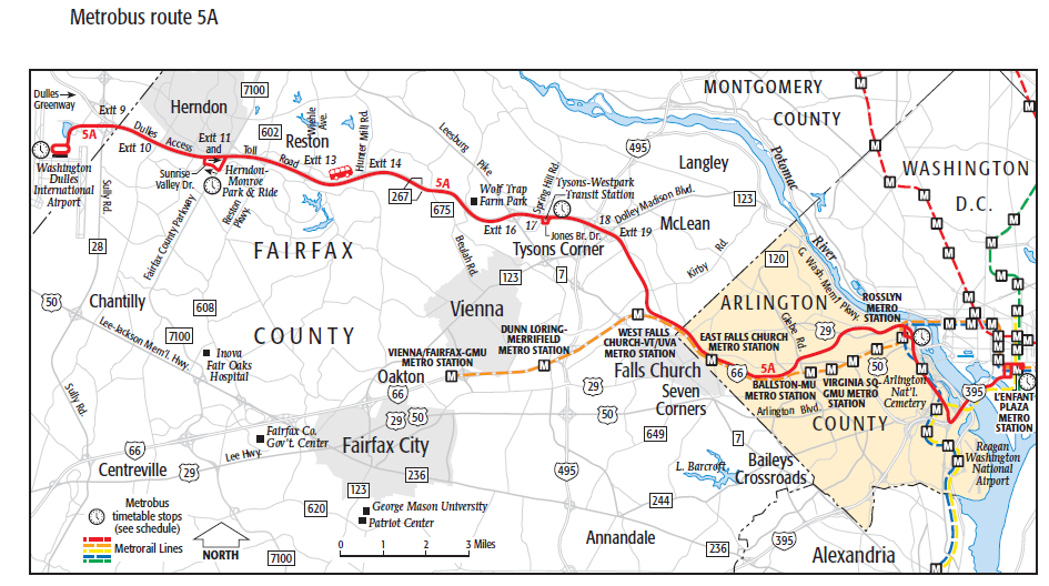 + Metrobus 5 A : Bu otobüsler 6 $ karşılığında , 40 - 60 dk. periot ve 45 dk.yol süresi ile sizi şehir merkezine ( L'Enfant Plaza Metro Station yada Rosslyn durağı ) taşımaktadır ( saat 06.00 - 23.30 arası ).
