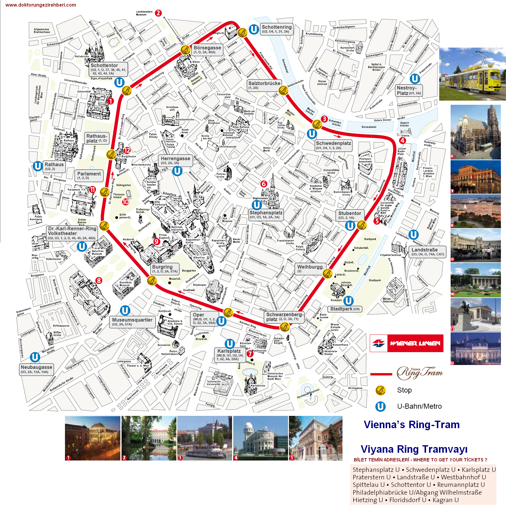 Ringstrasse : Güzergah üzerindeki 19.yy dan kalan tarihi yapıların görülmesinde iyi bir seçenektir.Tram no.1 ve 2 hatlarıyla bu binalar görülebilir.Tramvay müzesi dahil eski bir tarmvay ile yapılan gezi Otto Wagnerin Karlsplatz noktasında başlar. Turistik amaçlı kullanılan bu tramvay hattı ile önemli yerler gezilebilir ( Harita ).