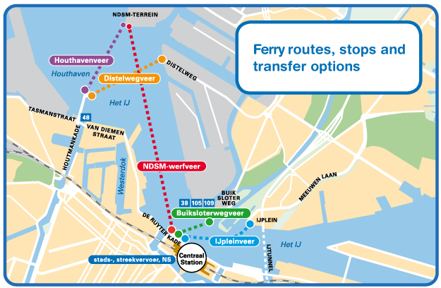 Central istasyonu , kuzey Amsterdam'a bağlayan güzergahta bazen 24 saate kadar ( 15 dk. aralıklarla ) çalışan GVB deniz botudur. Bisiklette alırlar. Benim anladığım , yol uzak olmasa da ulaşım imkanı yetersizliği ? nedeni ile buraya servis sağlanmış vede hareketlilik gelmesi amaçlanmıştır ? Ben binmedim ve deneyimim yok ! yol 5 dk. dolayında imiş.