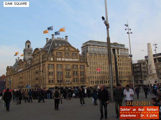 Şöyle meşhur alanı bir tanıdıktan sonra , geldiğimiz yoldan Beurs Plein ' e geri dönüp , Damrak Caddesinden meydana doğru ilerleyelim. Artık Dam meydanının yanı başındayız. Karşımızda Dam Square . Meydanın girişinde , caddenin başında yer alan Amsterdam' ın ünlü alışveriş mağazasını ( AVM ) göreceksiniz .