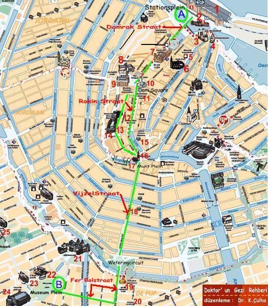 1 Central Station / 2 VVV İnformation / 3 St. Nicolaaskerk / 4 Schreierstoren / 5 Museum Amstelkring / 6 Oude Kerk / 7 Beurs van Berlage / 8 Nieuwe Kerk/ 9 Madame Tussauds / 10 National Monument / 11 Amsterdam Diamond center / 12 Amsterdam Dungeon / 13 Amsterdam Historisch Museum < + Kalverstraat > / 14 Begijinhof / 15 Allard Pierson Museum / 16 Munttoren ( Munt Plein ) / 17 Flower market ( Bloemenmarkt ) / 18 Museum Van Loon / 19 Heineken Experience / 20 Albert Cuypstraat / 21 Rijksmuseum / 22 Van Gogh Museum / 23 Stedelijk Museum / 24 Concert Gebouw / 25 Film Museum ( Vondelpark )