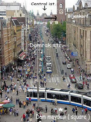 Evet , üstte görüldüğü gibi Merkez İstasyonunu arkamıza alıp Damrak straat ( caddesine ) girip , cadde boyunca yürüyelim.. Bir kaç yüz metre ilerde Avrupanın en büyük meydanlarından biri olan ( Dam Square ) rahatlıkla görülecektir.