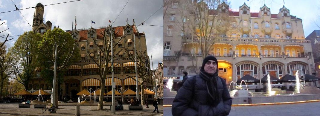 Biraz ilerleyelim. Ve Singelgracht kanalına yakın ( Stadsschouwburg ile kanal arasına sıkışmış ) Leidsekade 'de önünde , fiskiyeli havuzu olan " Cafe & Hotel Eden Amsterdam American " oteli göreceksiniz..