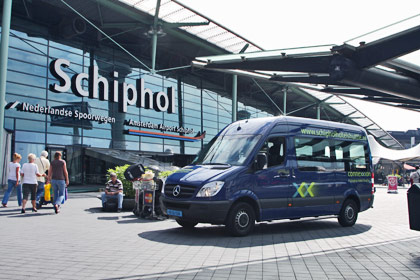 100 otel için hizmet sunar. Saat 06 - 21 arasında 30 dk. aralıklarla minibüsler kalkar. Tek yön 15 , gidiş dönüş 25 € ücreti vardır. ( Arrivals / Geliş salonu dışında A 7 platformundan ). Schiphol'e dönüş saatinden en az 2 saat önce rezervasyonunuzu yapın.