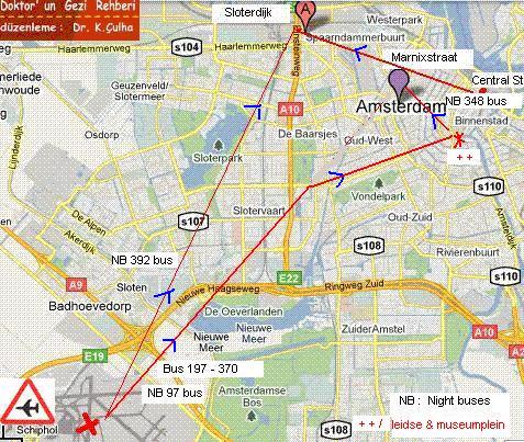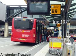 Alanın hemen çıkışından kalkarlar. Şoförden de bilet alabilirsiniz ( tek yön - 4 € , 15 dk. da bir sefer mevcut ). 25 - 50 dk. süren yolculukla sizi şehir merkeze yakın Marnixstraat 'a bırakır ( Leidseplein ve Museumplein üzerinden gelerek - ki buralar, merkeze yakındır < Müzeler bölgesi > . Buradan da eğer biletiniz bağlantılı ise ( connexion ) bir başka vasıta ile yolculuk devam eder ( alttaki resme bakın ) .Bu otobüslerle Central istasyona gidemezsiniz ! Dikkat !..Leidseplein yada museumplein de inip , aktarma yapacaksınız ( Connexion ).. ayrıca ayni yerden , saatte bir , Marnixstraat ' gece otobüsü olan ( Niteliner N 97 ) ile de , 4 € ulaşabilirsiniz..