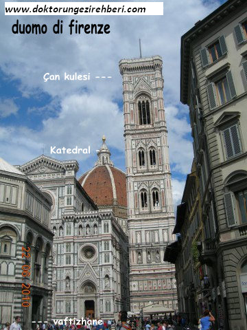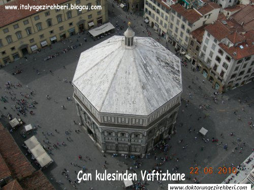 Duomo dan bağımsız duran “ campanile ” = çan kulesi ( Giotto's Bell Tower ) Duomo’ya uygun olarak; yeşil – beyaz – pembe renkli mermerlerden yapılmıştır.Bu yapıt katedralin yüksekliğine göre kısa tutulmuştur.414 basamak çıkılarak ( dar alanda – ücretli ) şahane manzarıyı seyredebilirsiniz.