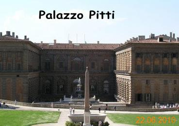 Bu büyük sarayı Medicileri etkilemek için tüccar “ Luca Pitti ” gücün ifadesi amacıyla yaptırmıştır.Mediciler ,Pitti’nin ölümü sonrası sarayı satın alarak büyütmüşlerdir.Bu alanda 7 adet müze ve galeri vardır.En önemlisi Galeria Palatina’dır.Yeşillik açısından zengin bir bölgedir.Bu müze değerlisanat koleksiyonlarına ev sahipliği yapar.Rubens,Raffaello , Boticelli ustalarının eserleridirler..
