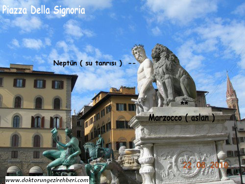 1504 yılında Michelangelo’nun ünlü eseri “ Davud ” cumhuriyet sembolü olarak dikilmiştir.Bu meydanda yer alanı kopyadır.Aslı Akademi müzesindedir.Yanında 16.yy.da “ Bandinelli ” nin eseri olan “ Hercules ve Cacus ” yer almaktadır. Meydanın ortasına yakın alanda da ; Su tanrısı “ Neptün ” , şehrin hanedanlık arması olan “ Marzocco ” aslanı , Medici heykelinin yanı başında dururlar ( alttaki resimler )